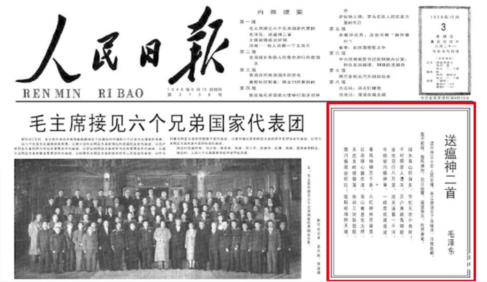1958年6月30日,《人民日報》報道了江西余江消滅血吸蟲病的消息。毛澤東主席得知后,欣然命筆,寫成了不朽的詩篇《送瘟神二首》——